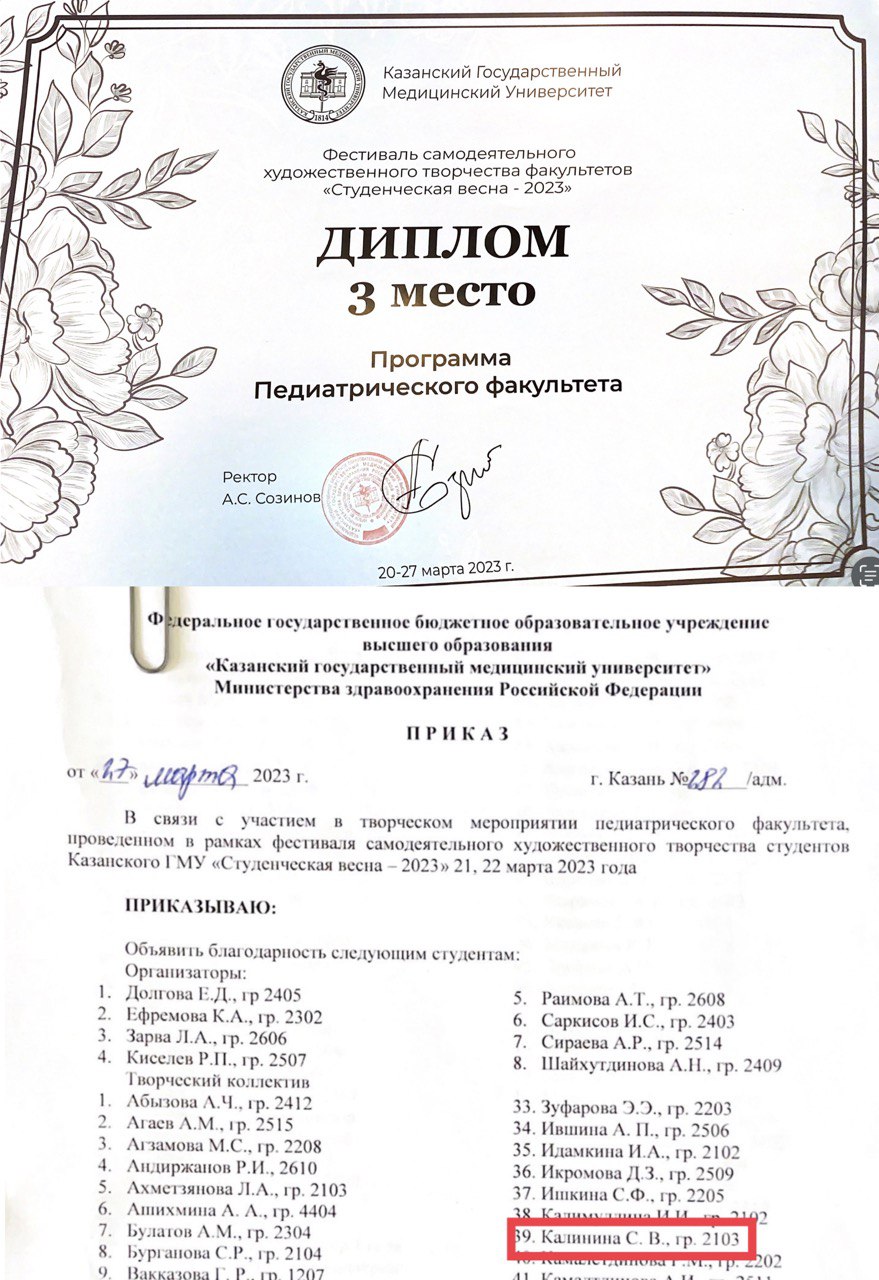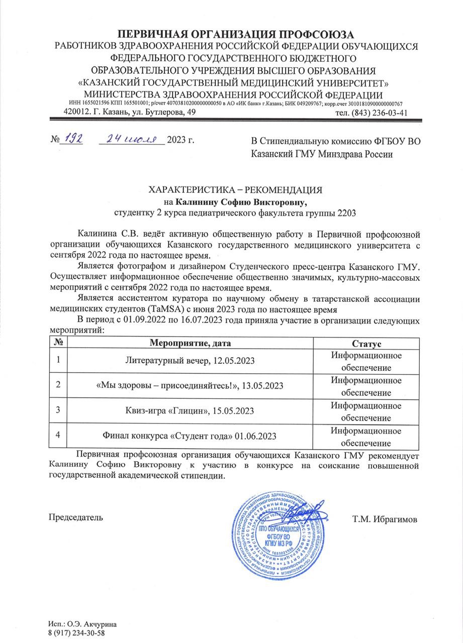 Калинина София Викторовна . Калинина София Викторовна 23.11.2003 Гражданство РФ +79870629225 sophiya.kalinina@gmail.com Педиатрический факультет Образовательная программа: 31.05.02 Педиатрия Форма обучения: очная Период, за который предоставлены материалы: 01.09.2022-16.07.2023 |